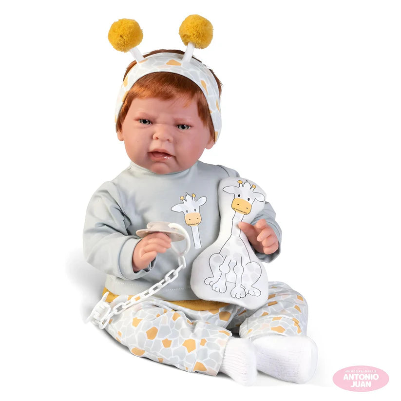 "Lea" es una muñeca recién nacida que captura el corazón con su diseño inspirado en una jirafa, añadiendo un toque de dulzura inigualable a su apariencia. Vestida con un encantador traje y adornada con una diadema que simula los cuernos de una jirafa, Lea invita a ser acogida con brazos abiertos gracias a su cuerpo de tela suave y sus extremidades de vinilo igualmente delicadas. Con una altura de 42 cm, está diseñada para ser el compañero perfecto de abrazos y aventuras para los niños.