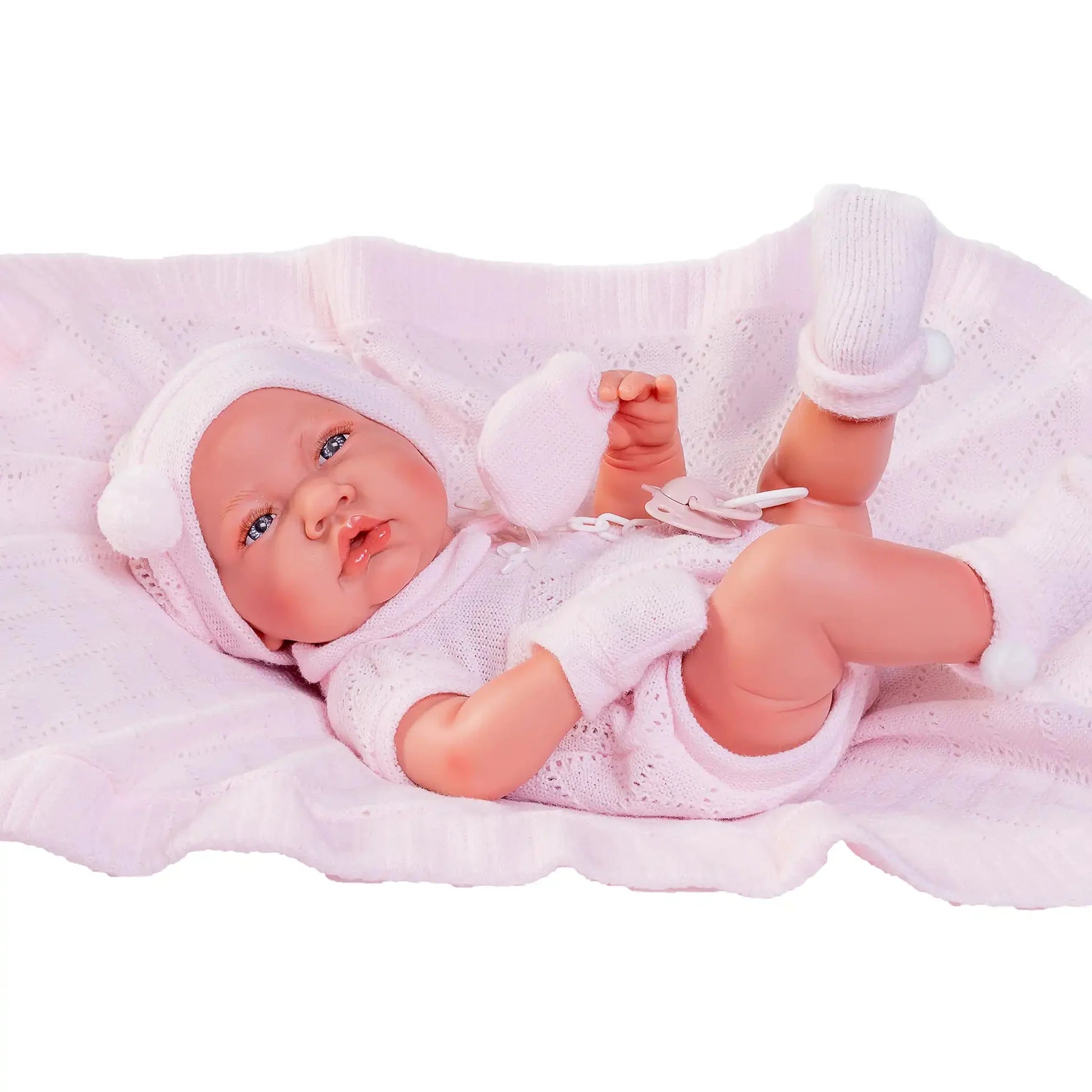 Recien nacida, con con ropita de punto en rosa. Está esperando a que la cojas en brazos para arrullarle con su toquilla. Con sus manoplas y calcetines a juego. Su cuerpo es de suave vinilo sexuado. ¡Esta Recién Nacida es una niña!. Mide 42 cm y estará encantada de salir a jugar contigo. ¿Hay algo más adorable que un bebé? Un universo de dulzura creados para acompañar a los más pequeños a descubrir el mundo. Compañeros inseparables de largos días de juegos a los que no les falta detalle en sus tiernas facciones y calidad de su ropita y complementos.