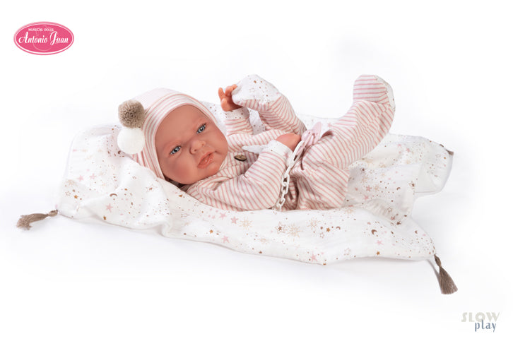 Lea está preparada con su pijama con rayas rosas y su gorrito a juego para irse a la cama a descansar. Arrullala en su dulce mantita de estrellas rosas y verás como pronto se relaja. Su cuerpo es de suave vinilo sexuado. Mide 42 cm y le encanta acurrucarse en su mantita en tus brazos. ¿Hay algo más adorable que un bebé? Un universo de dulzura creados para acompañar a los más pequeños a descubrir el mundo. Compañeros inseparables de largos días de juegos a los que no les falta detalle en sus tiernas facciones y calidad de su ropita y complementos.